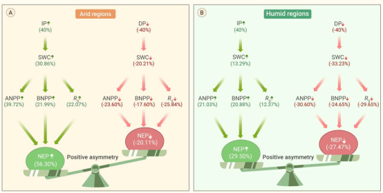 图2 干旱区(A)和湿润区(B)碳收支对降水改变的非对称响应机制,IP:降水增加,DP:降水减少,SWC:土壤含水量。