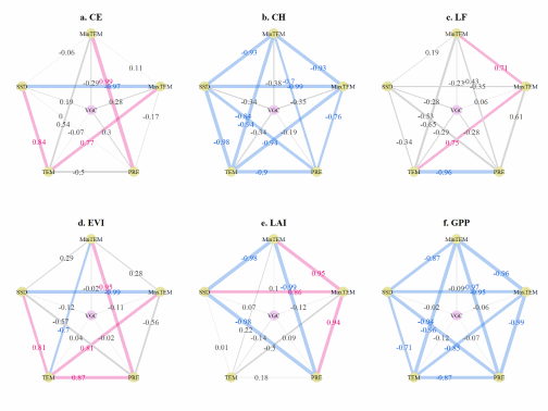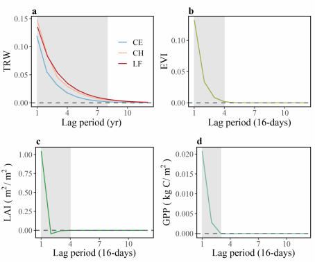 结果表明,VGC对径向生长和光合能力的贡献都超过85%,支持了VGC主导植被生长的假设。植被生长的VGC和LCE之间不存在显著相关性,表明两者之间可能存在解耦关系。此外,径向生长与光合能力之间不存在显著相关性,表明树木年轮生长与冠层响应之间可能存在脱钩关系。同时,在不同物种间VGC和LCE存在物种特异性,与环形多孔物种(枫香)相比,扩散多孔物种(甜槠和锥栗)表现出更强的VGC效应和更弱的LCE效应。该研究成果将不同尺度的植被生长延续效应与气候滞后效应联系起来,为理解植被动态变化过程提供了新见解。