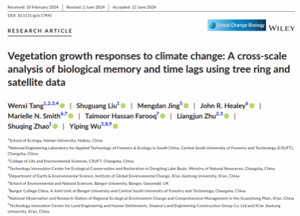 近日,刘曙光教授团队以“Vegetation growth responses to climate change: A cross-scale analysis of biological memory and time lags using tree ring and satellite data”为题在生态学Top期刊Global Change Biology (SCI Q1, IF=10.8) 上发表最新研究成果(原文链接://doi.org/10.1111/gcb.17441)。海南大学与中南林业科技大学联合培养博士生汤雯茜为论文第一作者,刘曙光教授为通讯作者,私密直播