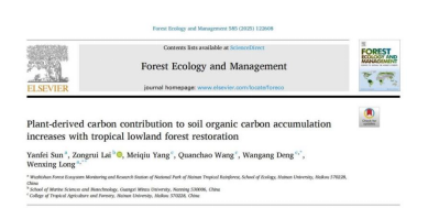 论文题目为《Plant-derived carbon contribution to soil organic carbon accumulation increases with tropical lowland forest restoration》,发表在在Forest Ecology and Management期刊,孙延菲副教授为第一作者,龙文兴教授为共同通讯作者(//doi.org/10.1016/j.foreco.2025.122608)。